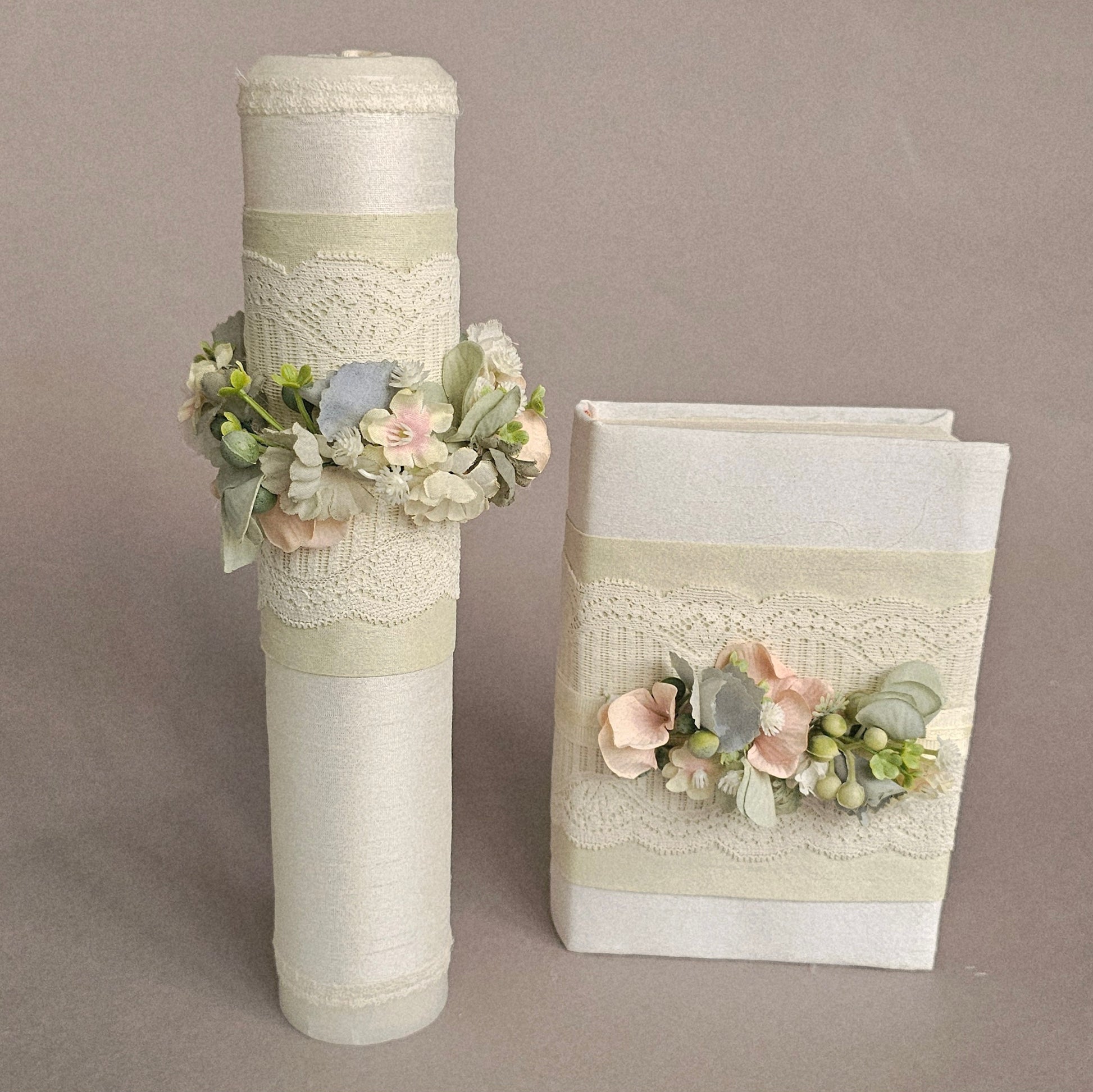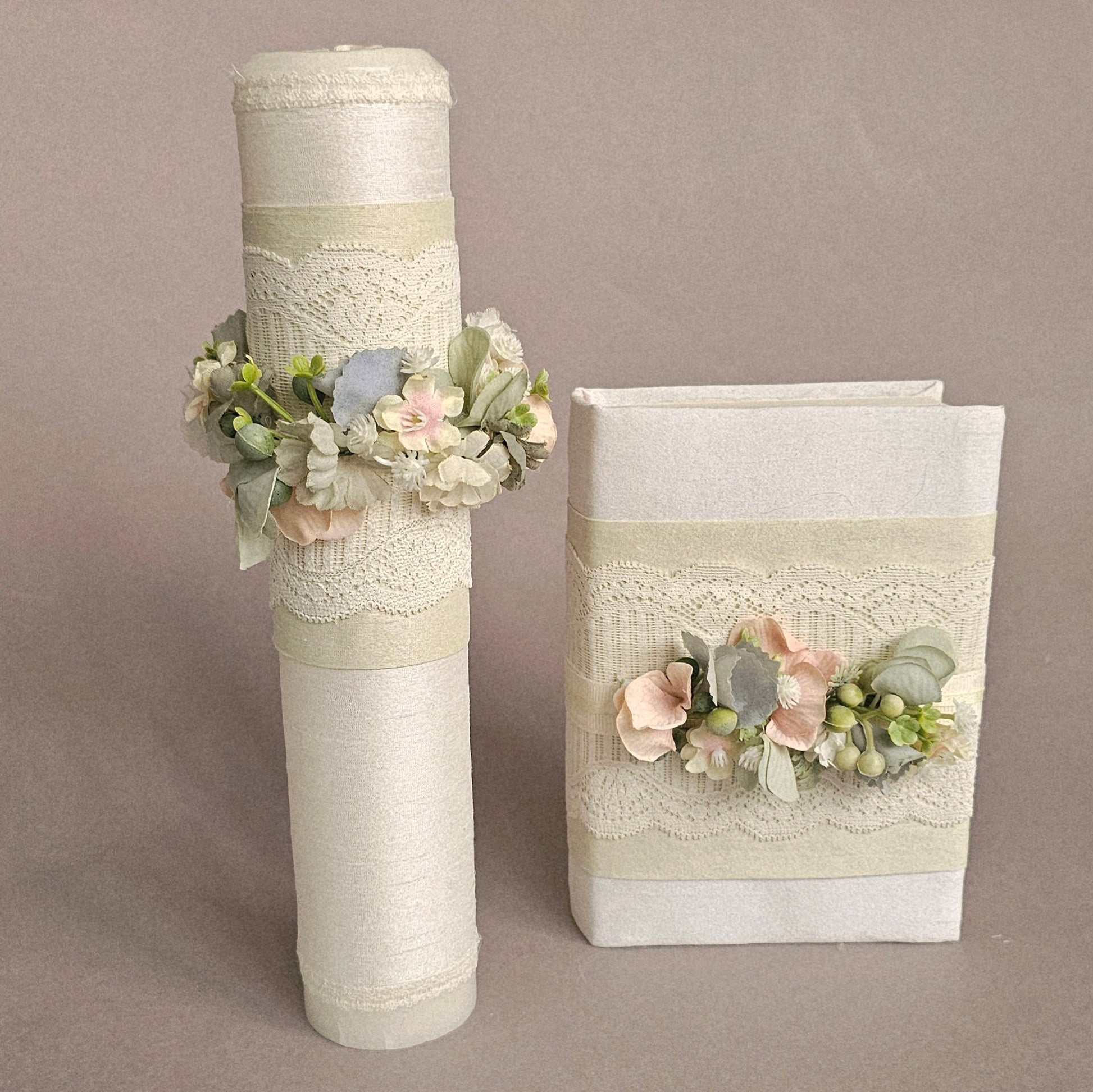 Juego de vela y Biblia para Primera Comunión forradas y decoradas con flores.