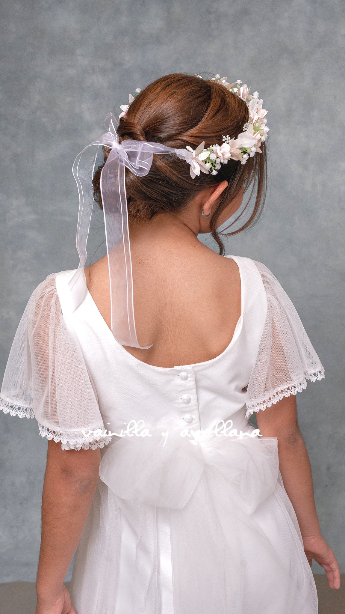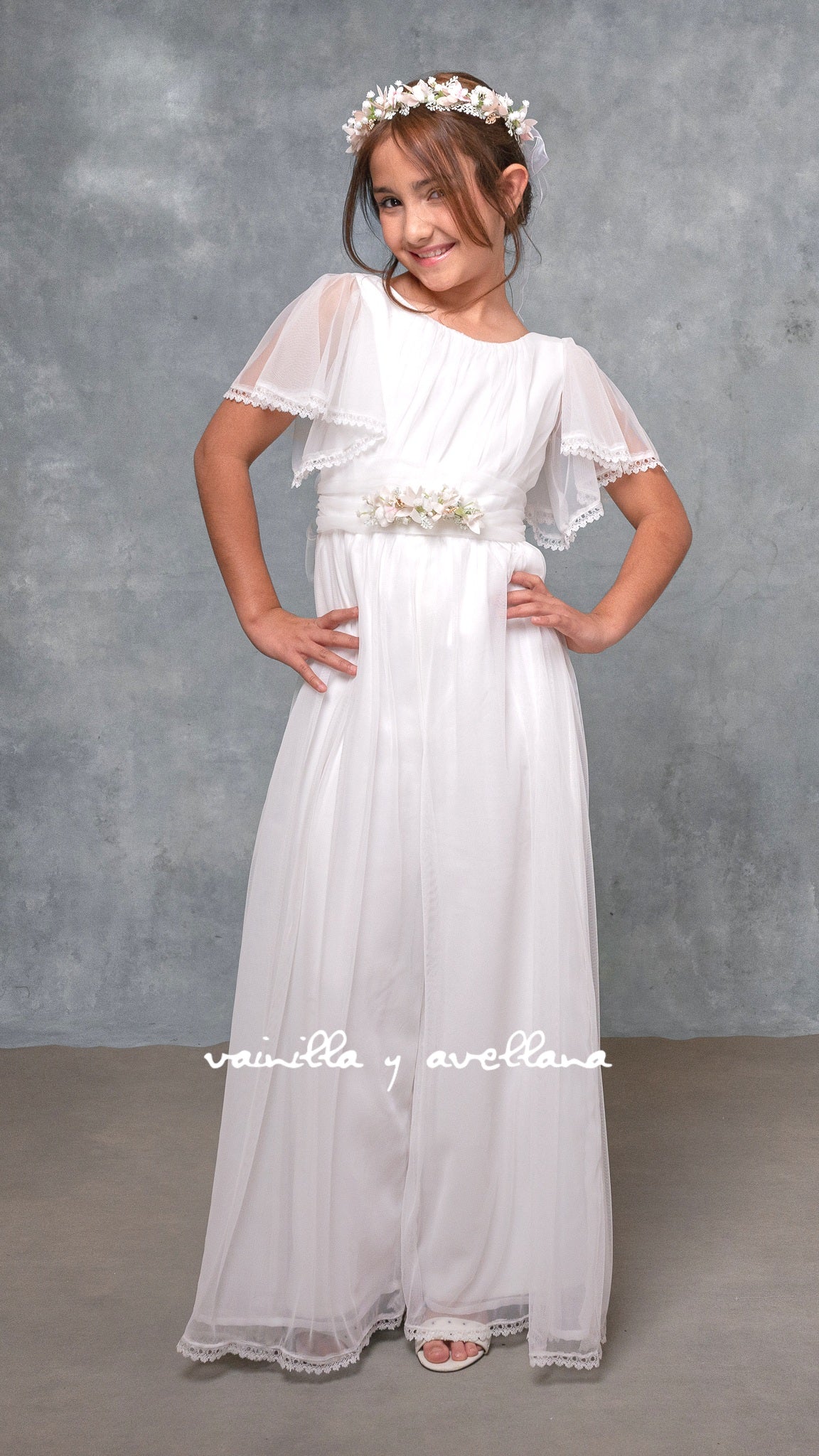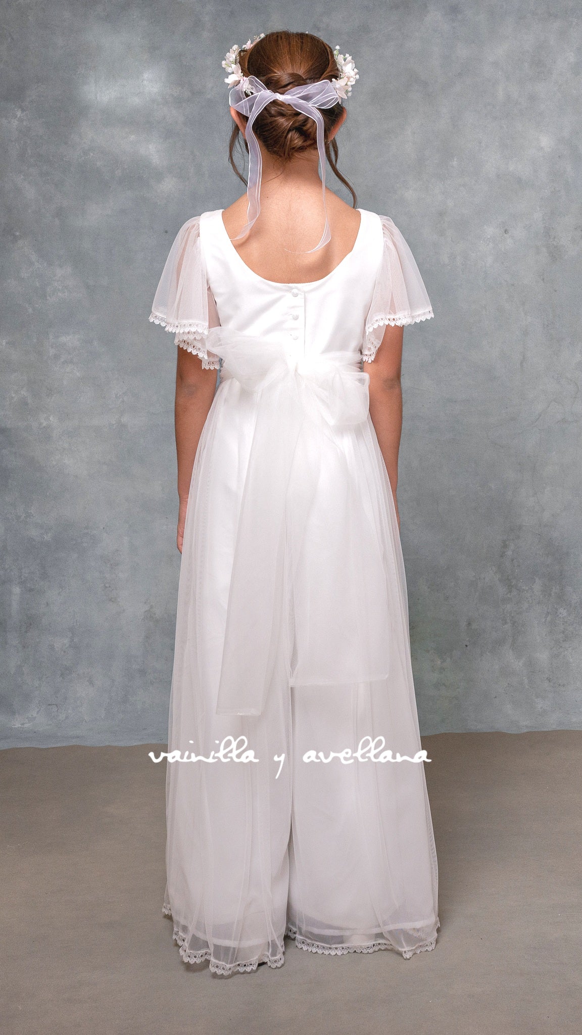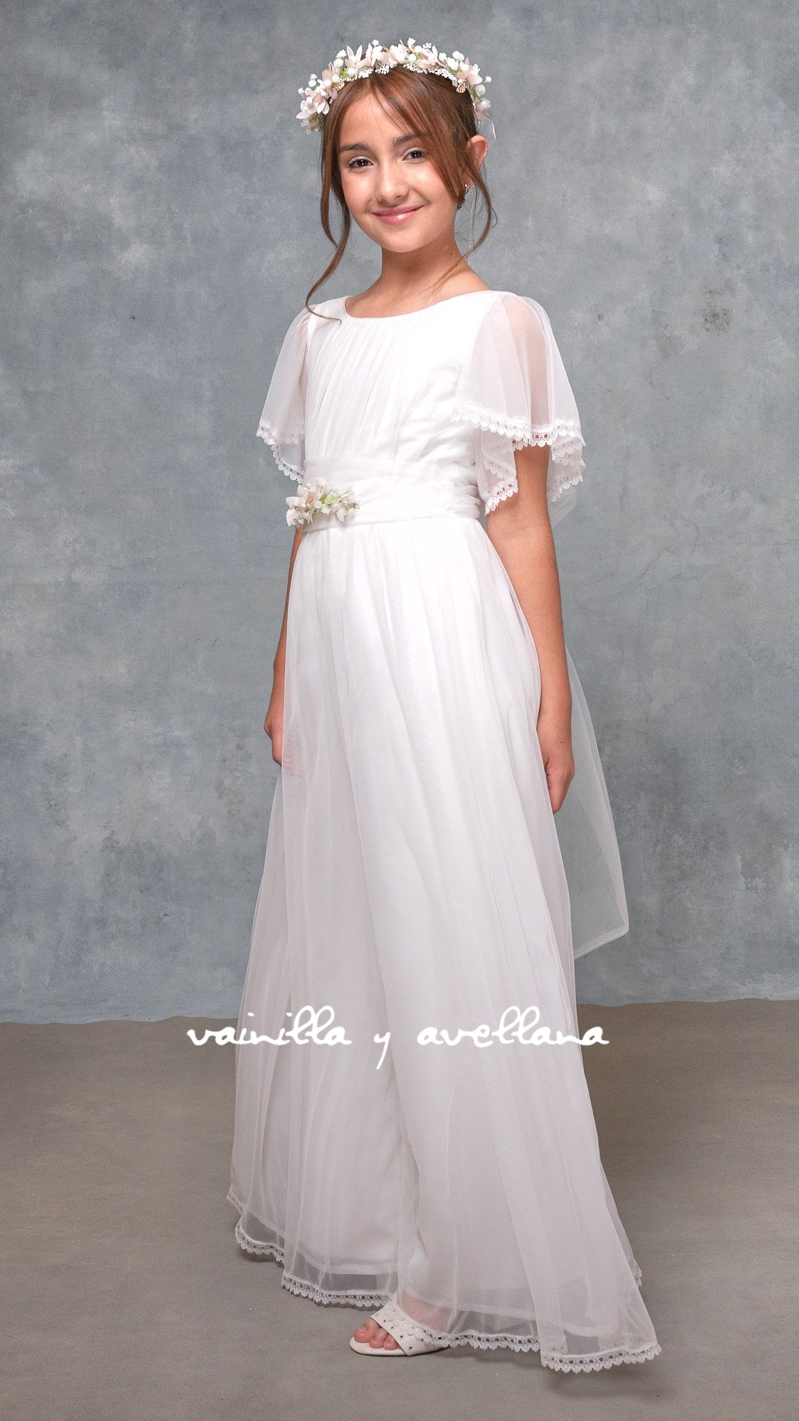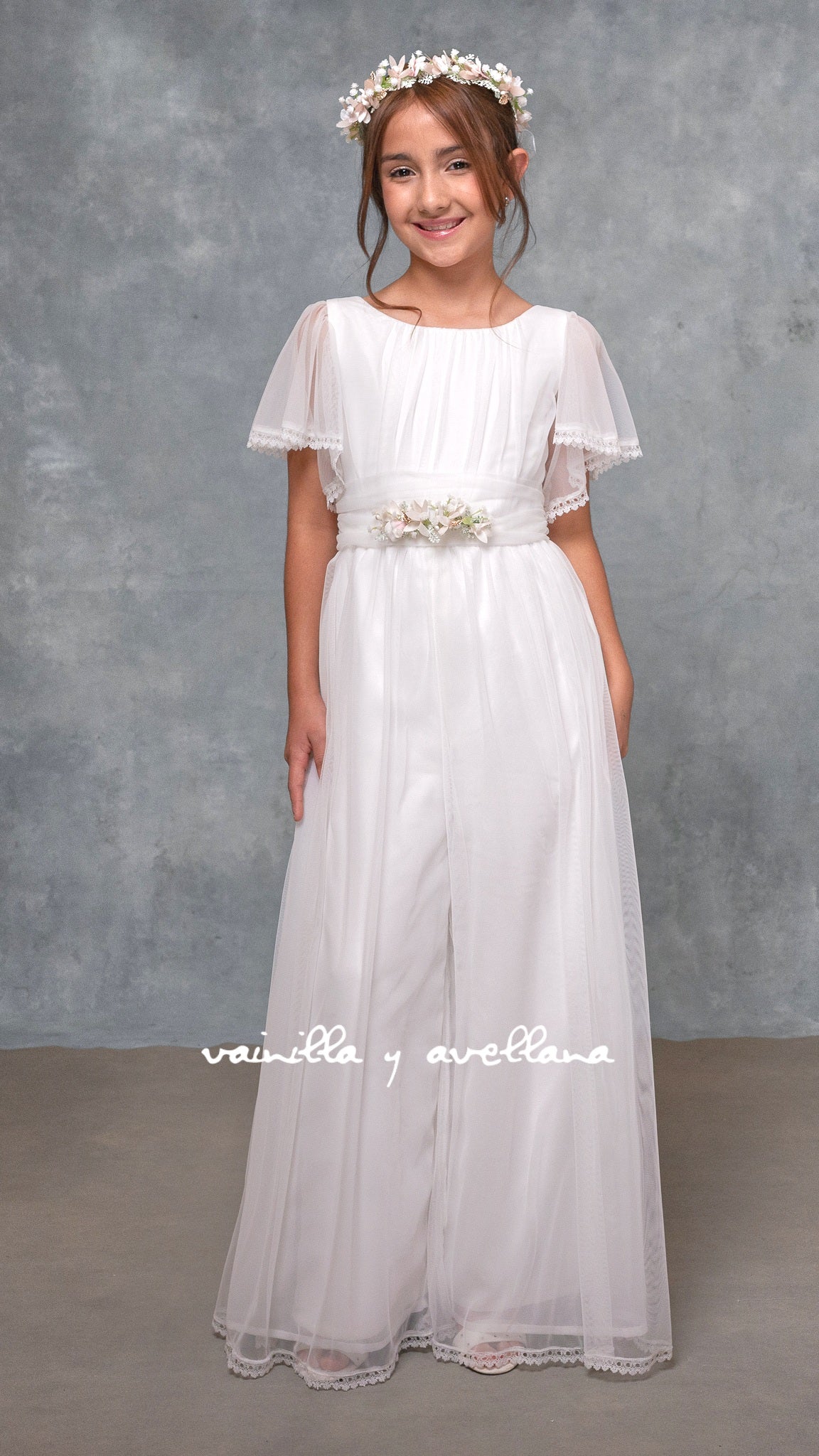 Mono completo de palazzo para primera comunión color off-white modelo Aurora. El palazzo esta confeccionado en punto drapeado y manga volante con orilla de encaje. El cinto de punto hueso y lleva adorno de exquisitas flores en color hueso hecho a mano. No incluye guía de la cabeza.
